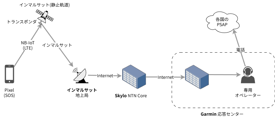 B: そうだね。Skyloは別にPixelの衛星SOSだけをやっている会社ではないので、Skyloコアからは様々な場所へデータは飛んでいくんだけど、Pixelの衛星SOSのデータに関しては、Garmin応答センターへ飛ばされる。