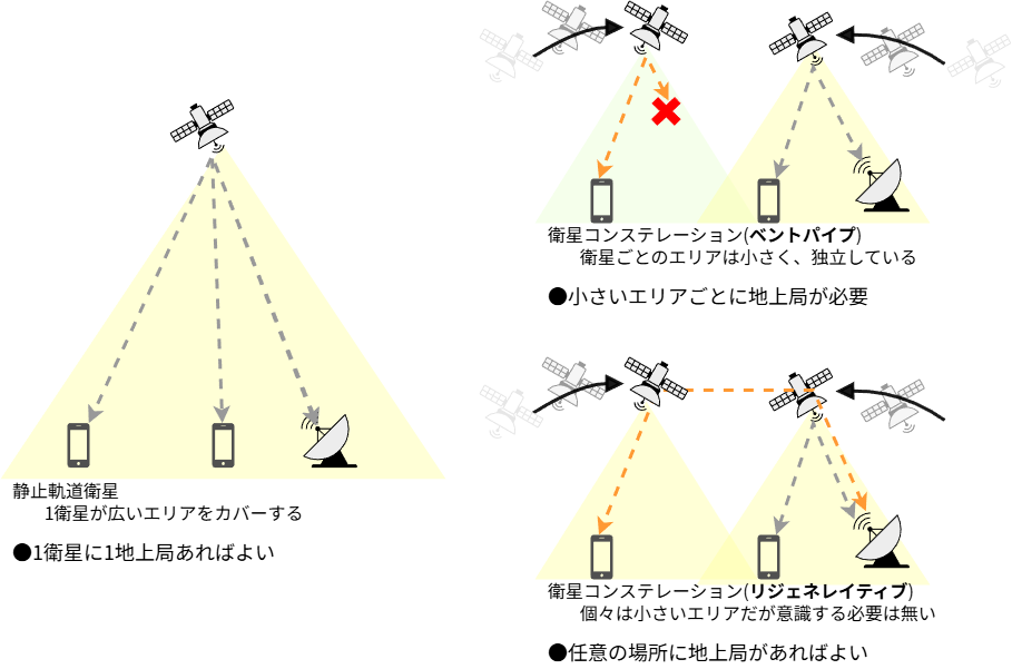 まず、ベントパイプ方式は電波を折り返すだけだから、衛星からはユーザー端末、つまりiPhoneと地上局の両方が見える状況でないと通信ができない。でも、それは静止衛星なら問題ない。衛星は(見かけ上)動かないので、1箇所の地上局が衛星に対して常に同じ方向を向いて通信していればよいだけだから、事実上地上局が見えているに決まっているので、そうなると結局衛星の電波の範囲がそのまま通信範囲ということになる。
